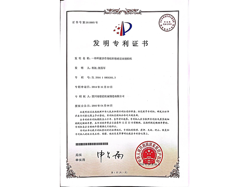发明专利证书-一种环保多作物秸秆粉碎还田脱粒机
