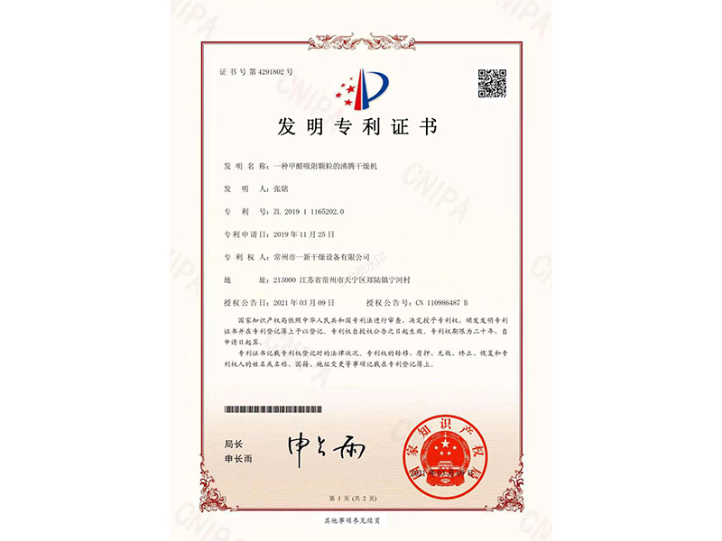 发明专利证书-一种甲醛吸附颗粒的沸腾干燥机