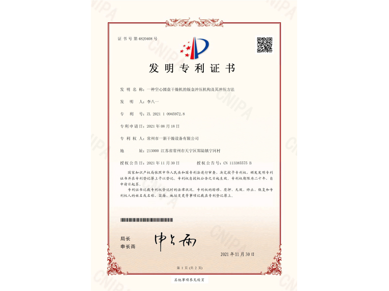 发明专利证书-一种空心圆盘干燥机的钣金冲压机构及其冲压方法