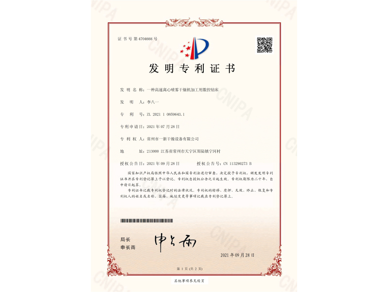 发明专利证书-一种高速离心喷雾干燥机加工用数控钻床