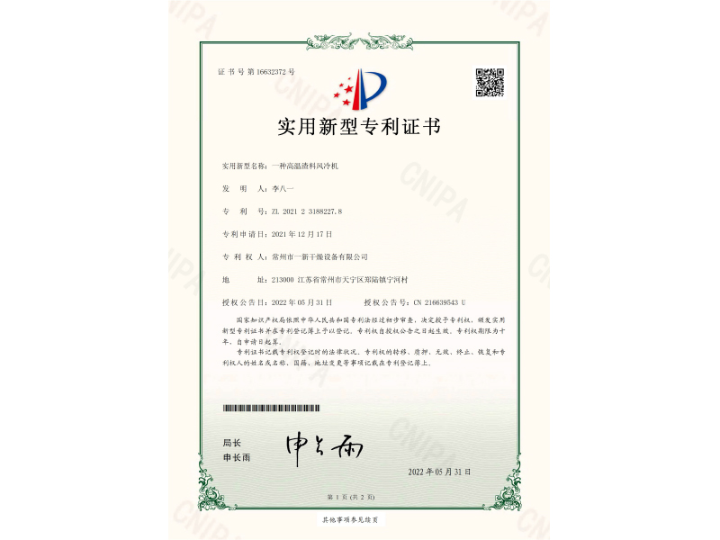 实用新型专利证书-一种高温渣料风冷机